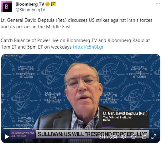 今天在彭博电视台的新节目权力平衡早间版,主持人乔·马修和凯利·莱因兹采访了退役空军中将大卫·德普图拉,谈论美国对中东事件的军事反应。