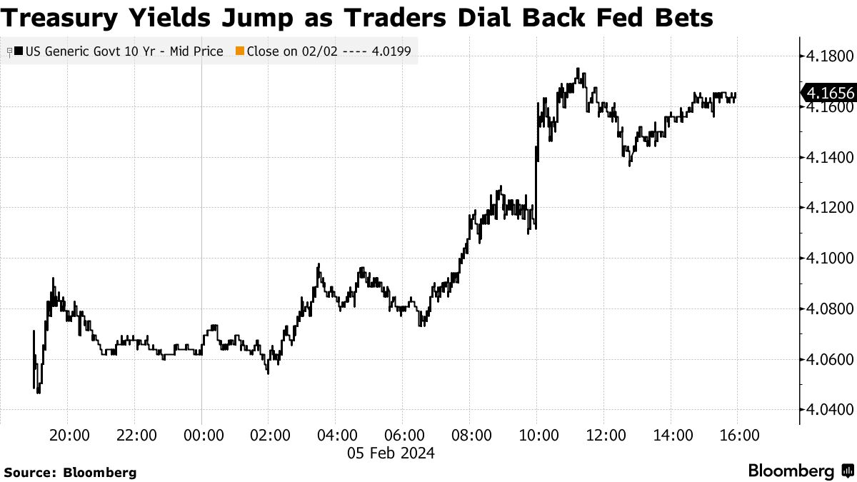 自上周五以来,10年期国债收益率上涨了28个基点,创下了自2022年6月以来的最大涨幅,这是在出乎意料的数据和一份服务业调查的支持下,强化了联邦储备委员会的信息,即降息可能在五月之前不太可能开始。在期货市场上,五年期和十年期合同的多头头寸被大量清仓,因为对三月降息的定价迅速消退。