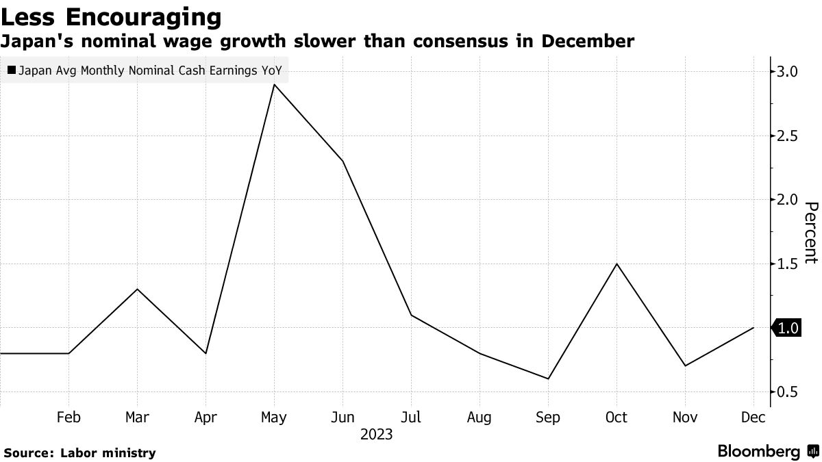 摄影师:Kentaro Takahashi/Bloomberg日本12月份名义现金收入同比增长1.0%,受到0.5%的冬季奖金增长的帮助,劳动部周二报告。与前一个月相比加速,但低于分析师预期的1.4%增长。与一年前相比,增长相对较小,当时特别津贴推高了26年来的名义工资。