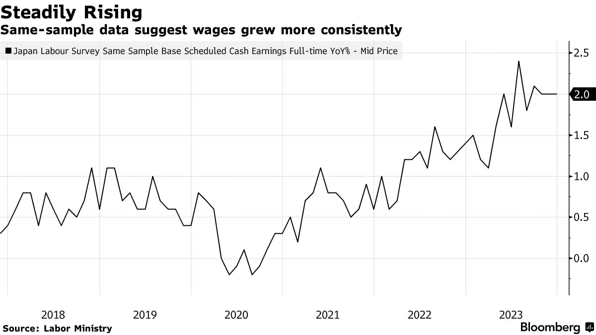 工资单稳定增长的证据是日本央行实现货币政策正常化的先决条件,这将是自2007年以来的首次加息。周二的混合结果是在央行上个月表示随着需求导向价格上涨,实现工资上涨目标的确定性正在增加之后出现的。