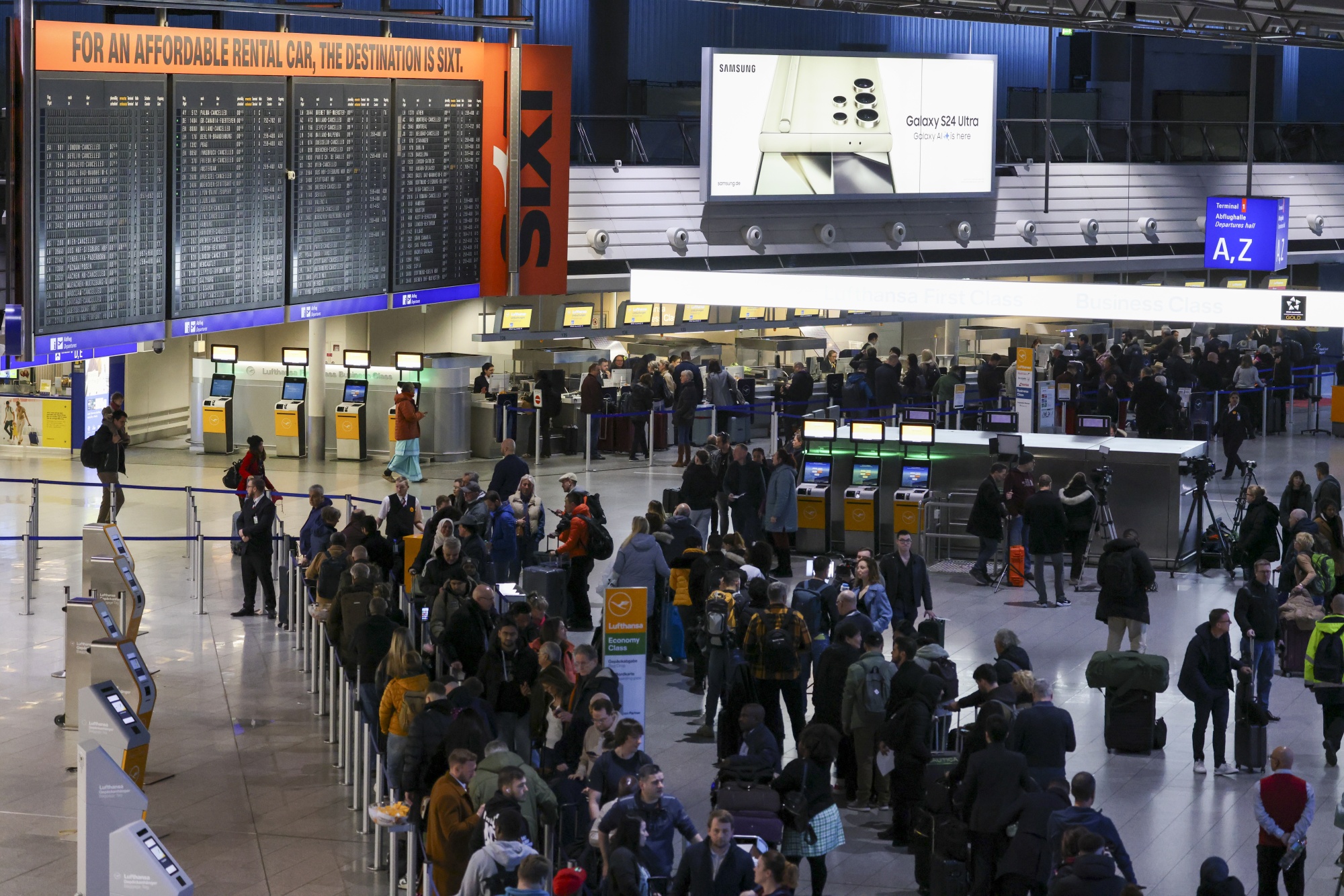 乘客在德国法兰克福机场排队,抗议机场安检工人的罢工,2月1日。