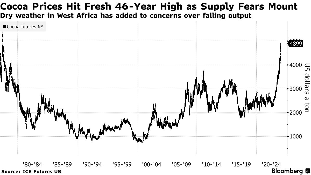 这加剧了全球对供应紧张的担忧,已经将价格推高至四十年来的最高水平。本季度顶级产区的产量不足已经对出口造成了影响,目前的出口量比上一季度减少了近40%。纽约可可期货周一一度飙升至每吨5200美元以上,随后略有回落。