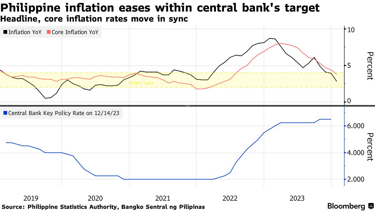 菲律宾央行行长埃利·雷莫洛纳上个月表示,年初不太可能降息,重申政策设置需要保持足够紧缩,鉴于通胀风险仍然存在。自2022年5月以来,央行已经进行了一系列加息,将政策利率维持在近17年的高位6.5%。