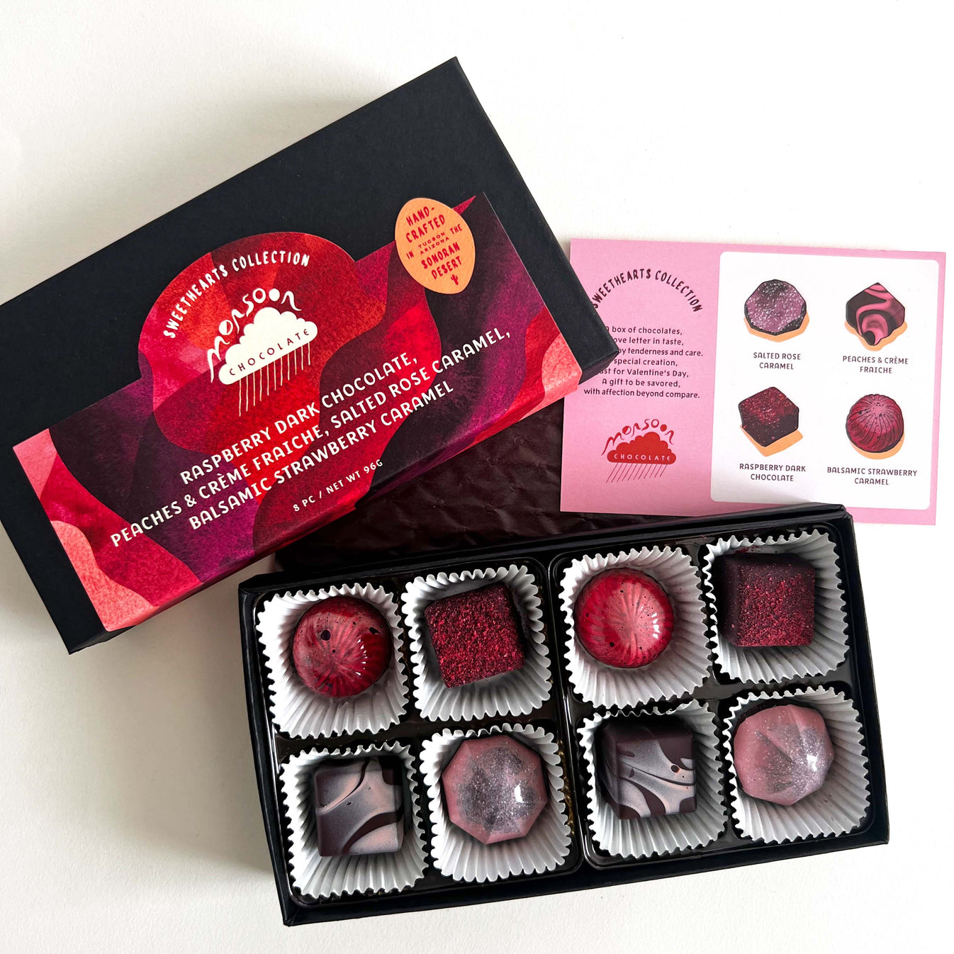 Monsoon Chocolate的糖果以西南地区的食材和风味为基础。这家糖果制造商以蓝玉米燕麦粥和豆科白巧克力等口味的巧克力棒而引人注目。在今年的情人节,合伙人亚当·克兰茨和阿西妮·克莱恩决定沉浸在他们认为最浪漫的风味中。这体现在一个装满粉色巧克力的盒子里,里面包裹着像盐玫瑰焦糖、香醋草莓焦糖、桃子和鲜奶油甘纳什等精妙的馅料。8颗装售价29美元