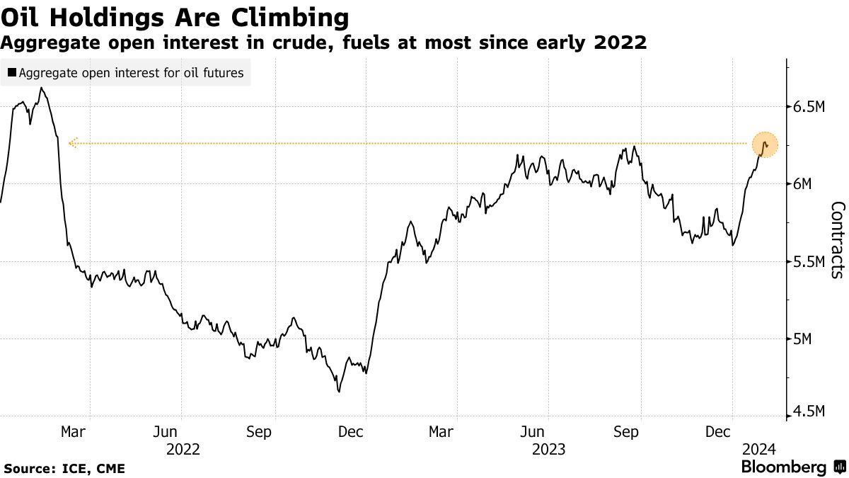 根据彭博社编制的数据,主要石油期货合约的持仓量——石油交易商持有的期货和期权的总量——已攀升至自2022年3月以来的最高水平。今年迄今,相当于约6.6亿桶石油衍生品已被添加,尽管原油价格一直牢牢地固定在每桶10美元的交易区间内。