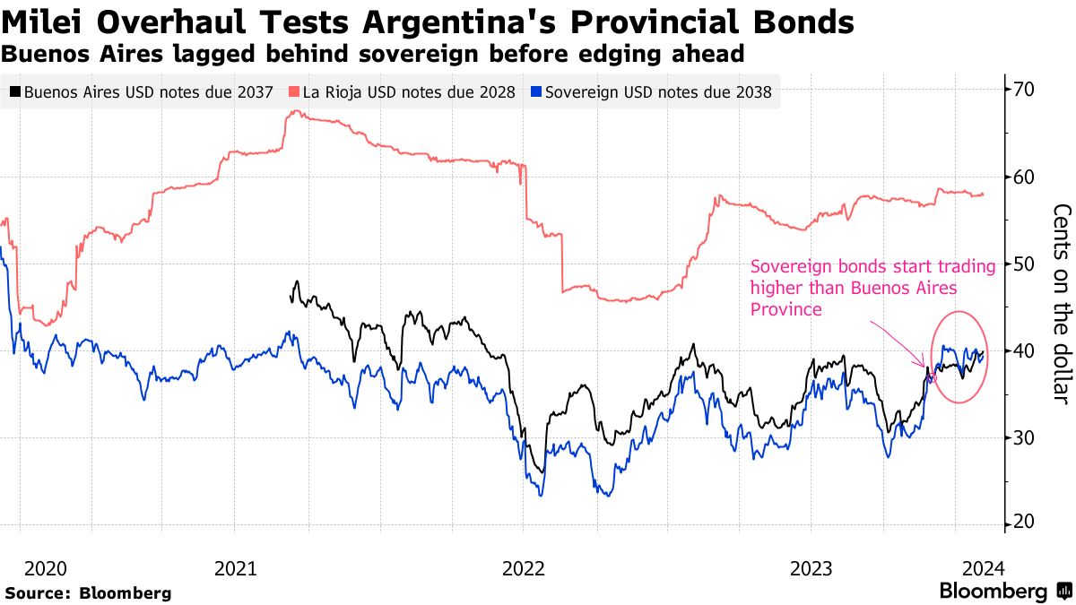 在Milei于12月10日上任后,布宜诺斯艾利斯2037年到期的债券首次跌破了3年前该省发行的重组债券2038年到期的主权债券,然后在上个月底再次略微领先。拉里奥哈2028年到期的美元债券,尽管交易价格高于主权债券,但在同一时期也出现了下跌。