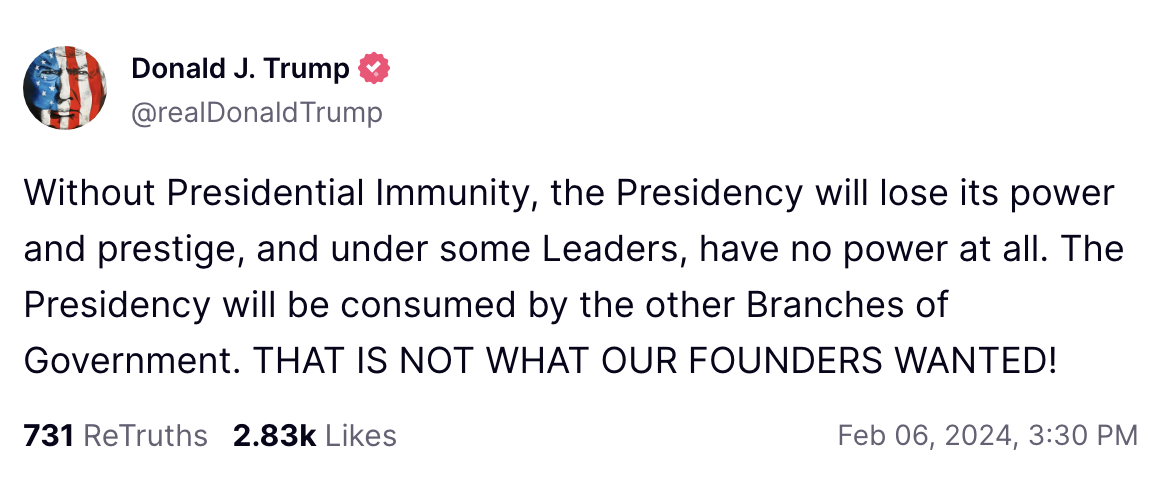 在一项具有里程碑意义的裁决中,一家联邦上诉法院裁定唐纳德·特朗普并不凌驾于法律之上。“他作为前总统并不具有免疫力。他在任期间也没有免疫力。法律就是法律,法院说了算,每个美国人都受其约束,”蒂姆·奥布莱恩写道(免费阅读)。很快,这个案件将上诉至最高法院,Noah Feldman说,“法官们不可能一本正经地拒绝上诉法院的常识性结论。”
