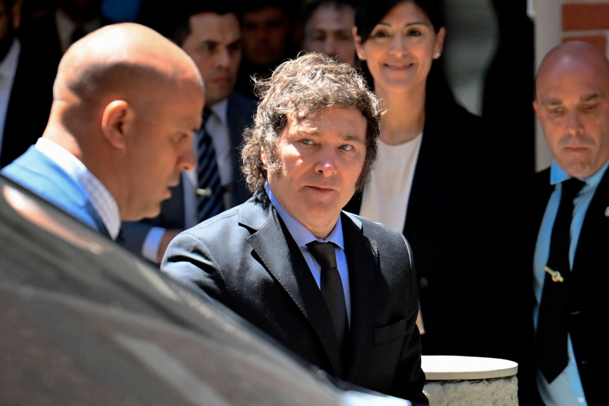 哈维尔·米莱在2024年1月26日离开布宜诺斯艾利斯的大屠杀博物馆。摄影师:路易斯·罗巴约/法新社/盖蒂图片社阅读更多: 米莱承诺将大使馆迁至耶路撒冷,拥抱以色列