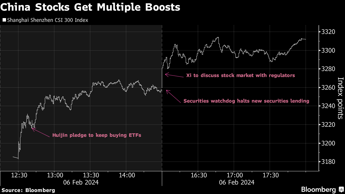 这一次火种是关于习近平主席将会与中国证监会会面讨论支撑股市的消息。紧随其后的是宣布禁止证券借贷(阻止做空交易的尝试),以及中国主权财富基金将资金投入交易所交易基金的消息。同事们的这张图表展示了消息的传播如何在周二的上涨中支撑了上海和深圳: