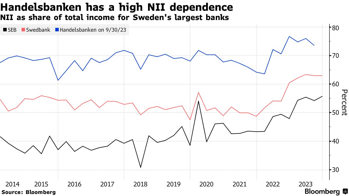 这家总部位于斯德哥尔摩的银行表示,其净收入为72.4亿瑞典克朗(约合6.9亿美元),超过了彭博社跟踪的分析师的预期。净利息收入——即贷款和存款利润的衡量标准——比去年同期增长了15%,达到122.2亿瑞典克朗,与平均预期相匹配。