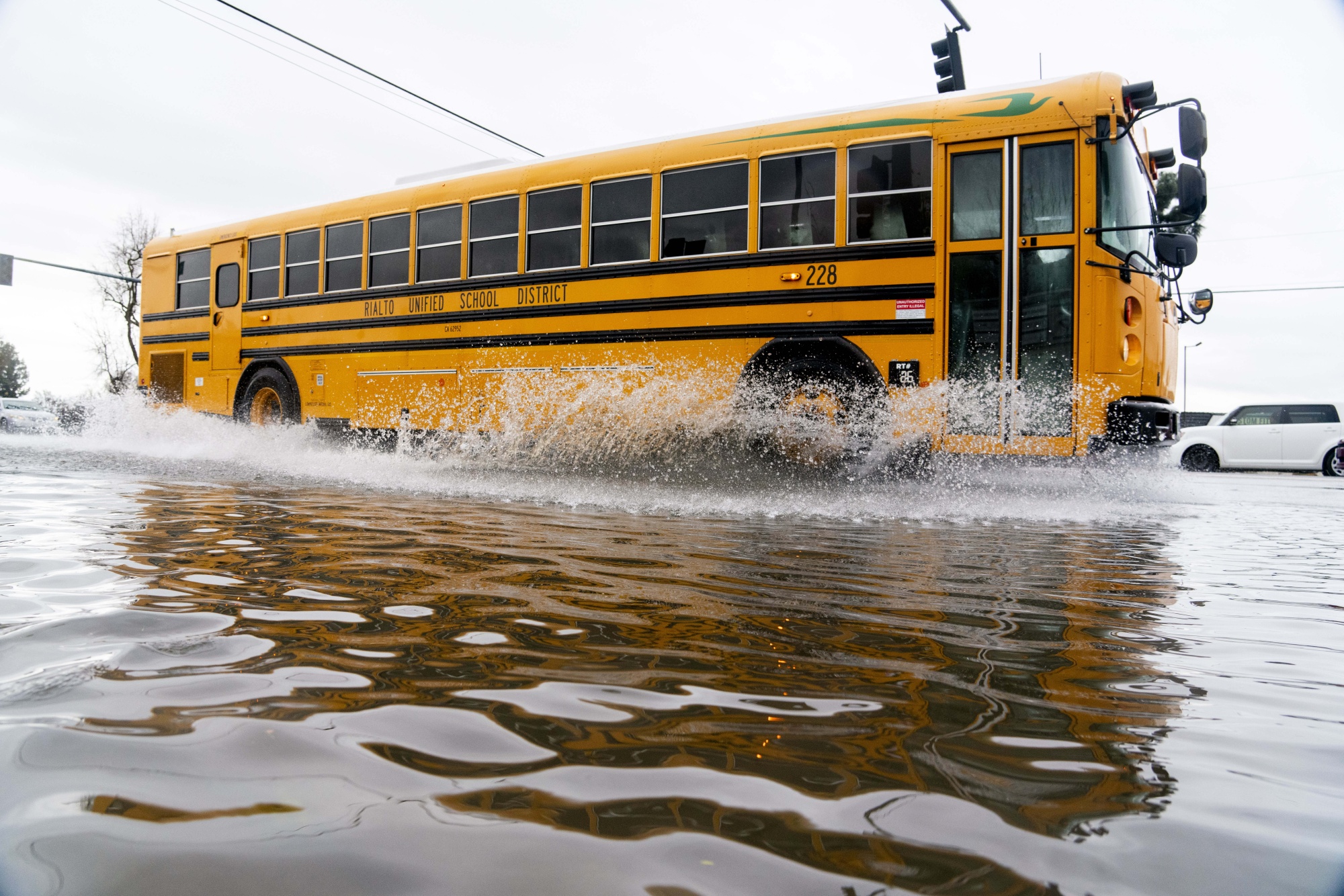 一辆校车在2024年2月6日穿越加利福尼亚州里阿尔托的洪水中。