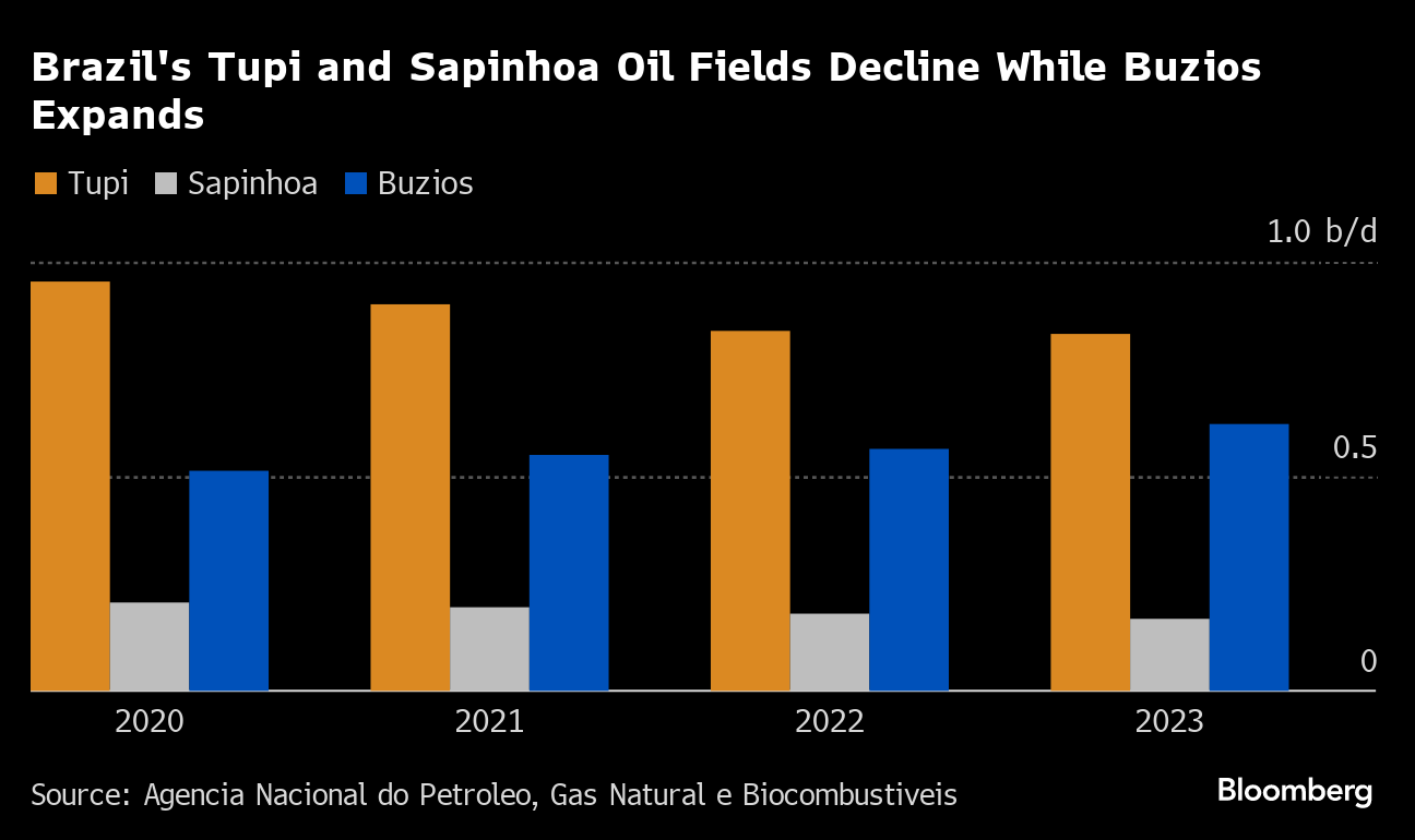 巴西石油公司的主要挑战是图皮油田。这是2010年投入生产的首个盆地,仍然是巴西产量最大的油田,去年石油产量达到了832,000桶/天。然而,自2020年达到峰值以来,其产量已经下降了13%。根据巴西石油、天然气和生物燃料国家机构(ANP)的数据,另一个较小的盆地Sapinhoá自2020年以来下降了18%。这些下降抵消了其他项目的增长,比如Búzios,它在潜力方面甚至超过了图皮。