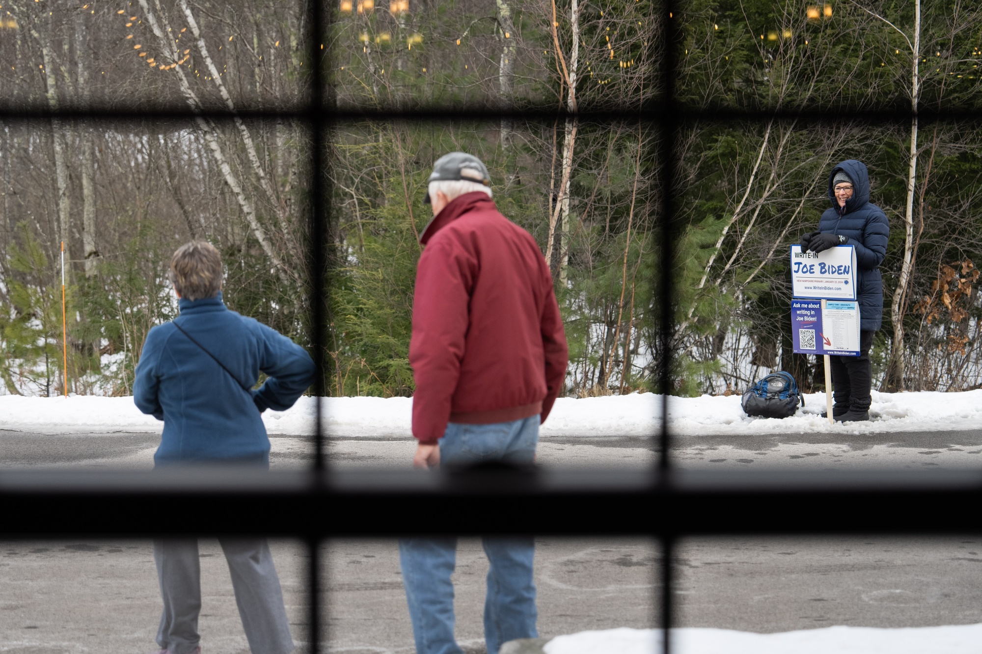 一名写信给乔·拜登的竞选者站在美国新罕布什尔州康科德的布尔牧场的谷仓外,这是新罕布什尔州初选的日期,即1月23日。