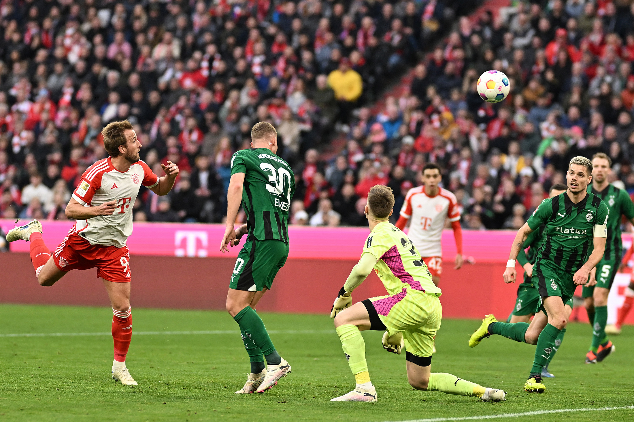 拜仁慕尼黑的哈里·凯恩在2月3日慕尼黑对阵门兴格拉德巴赫的德甲足球比赛中攻入进球。