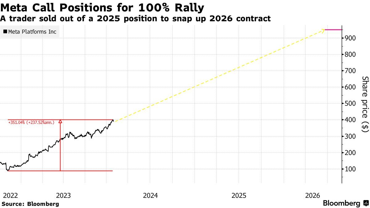 一个期权交易员似乎打算把对Meta Platforms Inc.的赢利赌注变成更大的收益,如果这家科技巨头在接下来的18个月内再次翻倍。周三早些时候,一名交易员卖出了一批到2025年6月到期的19,000份认购期权,允许持有人以600美元的价格购买190万股,换取了两倍数量的到期日一年后、行权价为950美元的认购期权,收取了1140万美元。