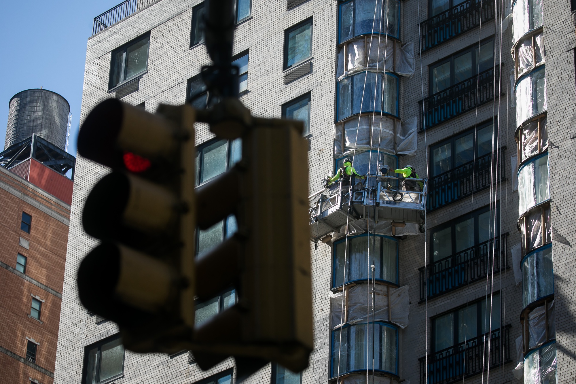 承包商修复纽约一栋公寓楼的外部。