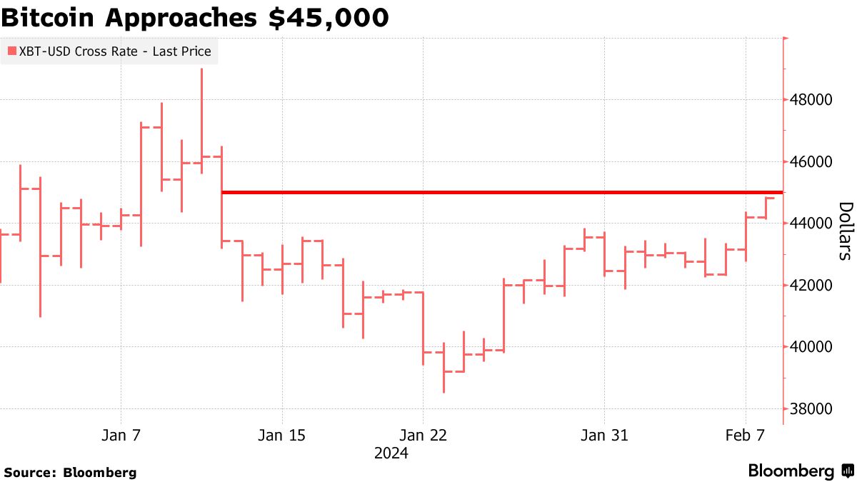这种最大的加密货币周四上涨了多达1.6%,至44872美元。比特币最后一次交易价格超过45000美元是在1月12日,也就是ETF开始交易的第二天。在最初由于Grayscale比特币信托基金的资金流出而受到拖累之后,这些基金已经连续九个交易日出现净流入。