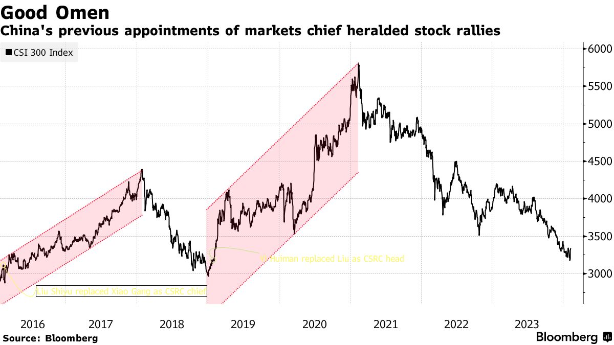 如果历史是任何指引,更多的收益可能即将到来。中国证监会主席的过去两次更迭预示着持续的股市上涨。2016年刘士余接替肖钢后,基准的沪深300指数在近两年内上涨了超过40%。2019年刘士余被易纲取代后,该指数在两年内上涨了超过80%。