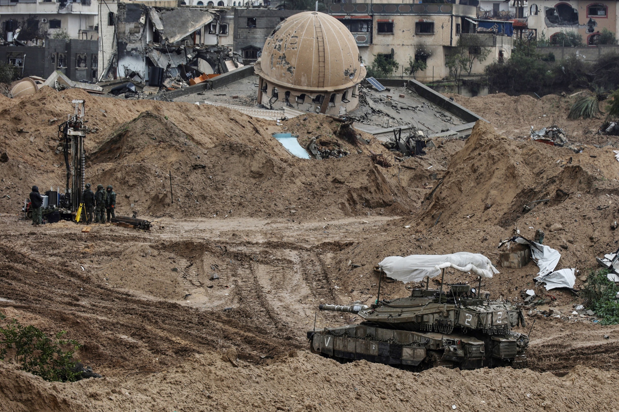 以色列军队的坦克驶过加沙汉扎尼斯的一座受损清真寺。