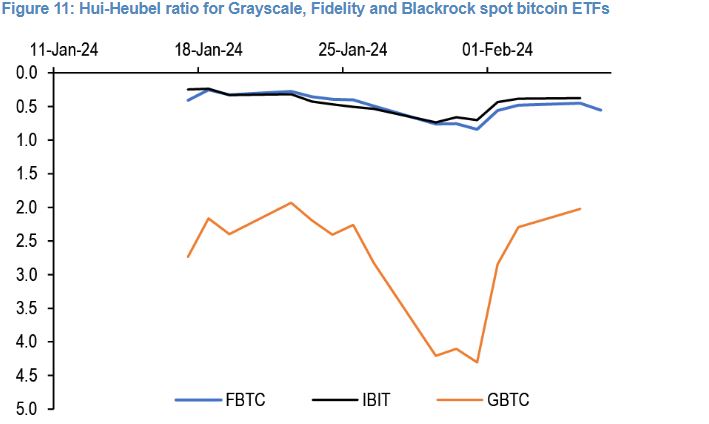 摩根大通团队包括尼古拉斯·帕尼吉尔佐格卢在内表示,黑石的iShares比特币信托和富达Wise Origin比特币基金在两项流动性研究中表现更好。其中一项分析使用了Hui-Heubel比率,据称可以衡量移动价格所需的交易次数。另一项比较了ETF的收盘价格和其净资产价值。