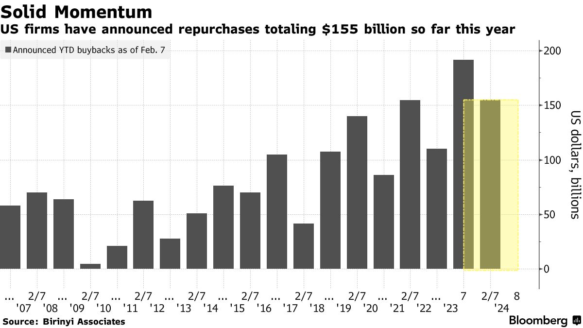 美国公司在2月的前七天宣布了总额达1050亿美元的计划股票回购,超过了1月份整月的总额。根据Birinyi Associates Inc.编制的数据,这是有史以来宣布的股票回购的最强劲开局,也是继2023年之后年度开局的第二好。