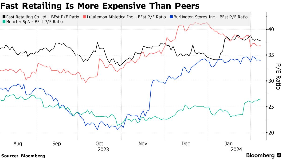 亚洲最大的服装制造商今年上涨了15%,成为全球市值超过100亿美元的其他10家服装公司中表现最佳的公司,据彭博社编制的数据显示。迅销公司的市盈率约为38,超过了美国的露露柠檬运动服饰公司和意大利的Moncler SpA的水平。