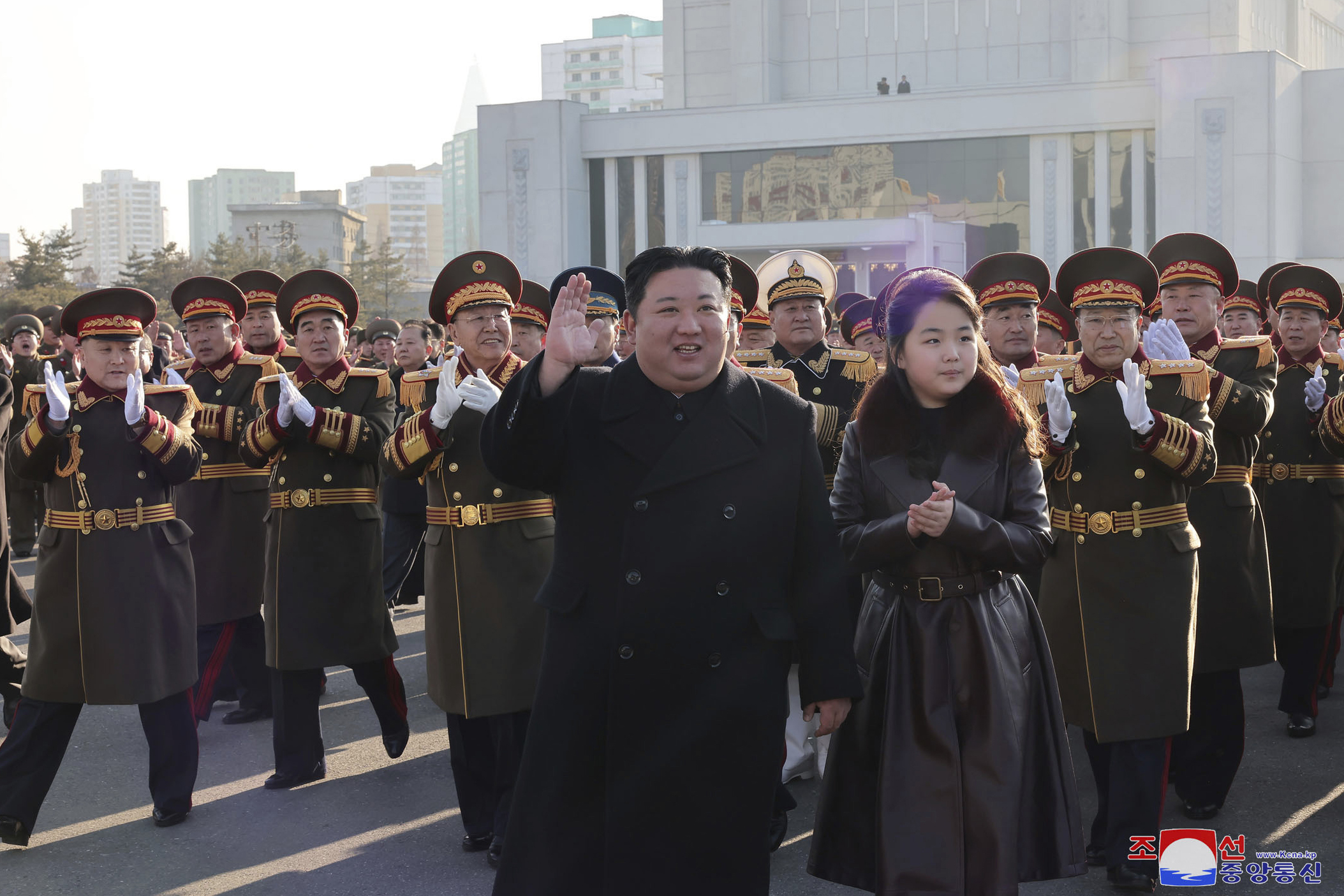 金正恩与他的女儿一起在国防部访问期间挥手,庆祝朝鲜军队成立76周年,时间为2月8日。来源:朝鲜中央通讯社/AP照片