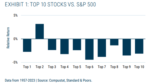 通常来说,购买市值最大的股票是一个不明智的决定。几乎可以说,它们的价格已经包含了所有好消息,未来只能走低。波士顿基金管理公司GMO的这张图表很好地说明了这一点,几乎可以肯定地说,任何时候购买市值最大的股票都会在接下来的12个月内带来低于市场水平的回报: