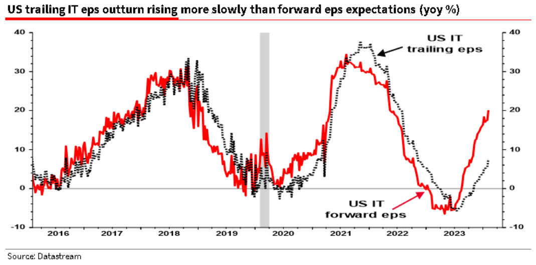 我们都知道,这些 巨头 是强大且盈利的公司,拥有良好的竞争地位。但是,将他们的主导地位归因于基本面仍然很困难。正如Societe Generale的不可动摇的艾伯特·爱德华兹在这张图表中所展示的,科技行业的每股收益确实在上升,但增长速度远远低于其未来收益预测。这并不寻常,可能是由于对人工智能对这些巨头的利润影响的过分乐观预测所致(包括Meta Platforms Inc.和Alphabet Inc.等不被归类为科技集团的公司)。做好价格发现工作的基金经理可能会预期利用这一点,押注科技股的下跌,但他们并没有这样做——可能是因为被被动投资的巨头所阻挠: