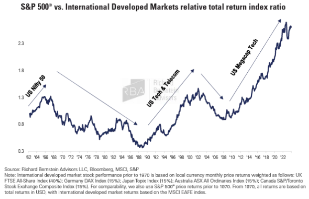从最新的增长趋势来看,他认为美国对其他发达国家的表现看起来是不可持续的。在以前的情况下,当它走得这么远时,它是受到过度集中和相对较小一组股票的泡沫的帮助:上世纪60年代的“Nifty 50”和上世纪90年代的科技股。这一轮最新的表现走得更远,但这可能要归功于被动投资者。上世纪60年代没有指数基金,而且这个概念在上世纪90年代远没有现在这么强大: