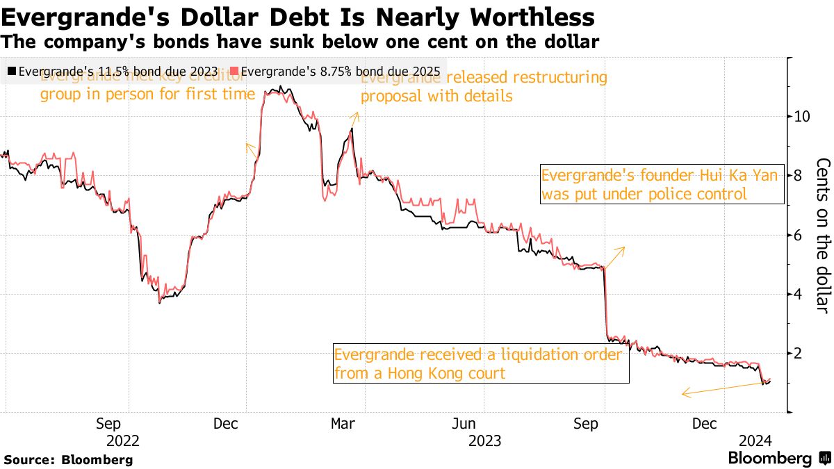 然而,去年年初,恒大和其债权人似乎接近达成一项协议,对公司的离岸债务负担进行改革。其到期日为2025年的47亿美元债券价格飙升至11美分。