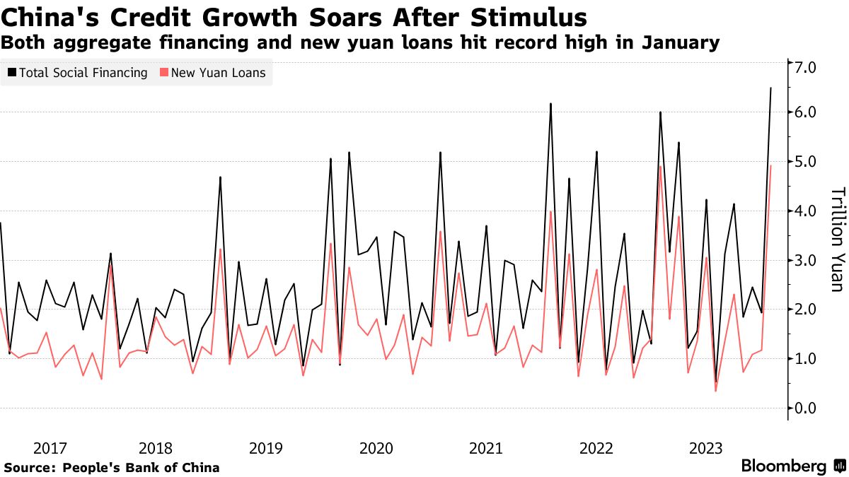 来源:彭博社随着政府支持经济的措施开始显现效果,中国的信贷增长在1月份激增至创纪录的水平。