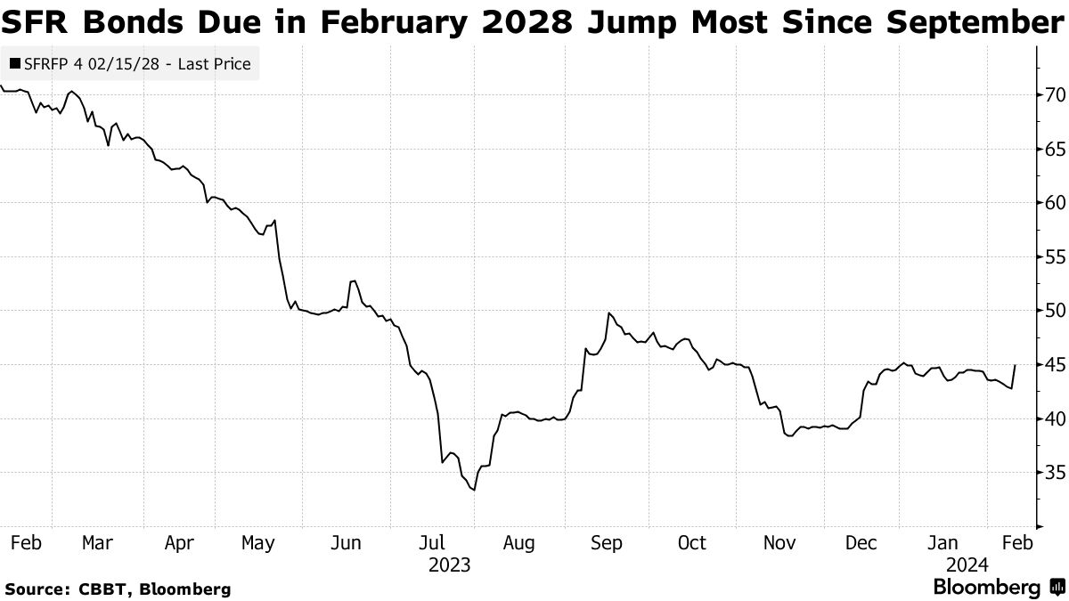 根据彭博社编制的数据,Altice France不同到期日的债券周五大幅上涨,到2028年到期的5亿欧元无担保票据上涨2.7欧分,至45欧分,为自9月以来最高。