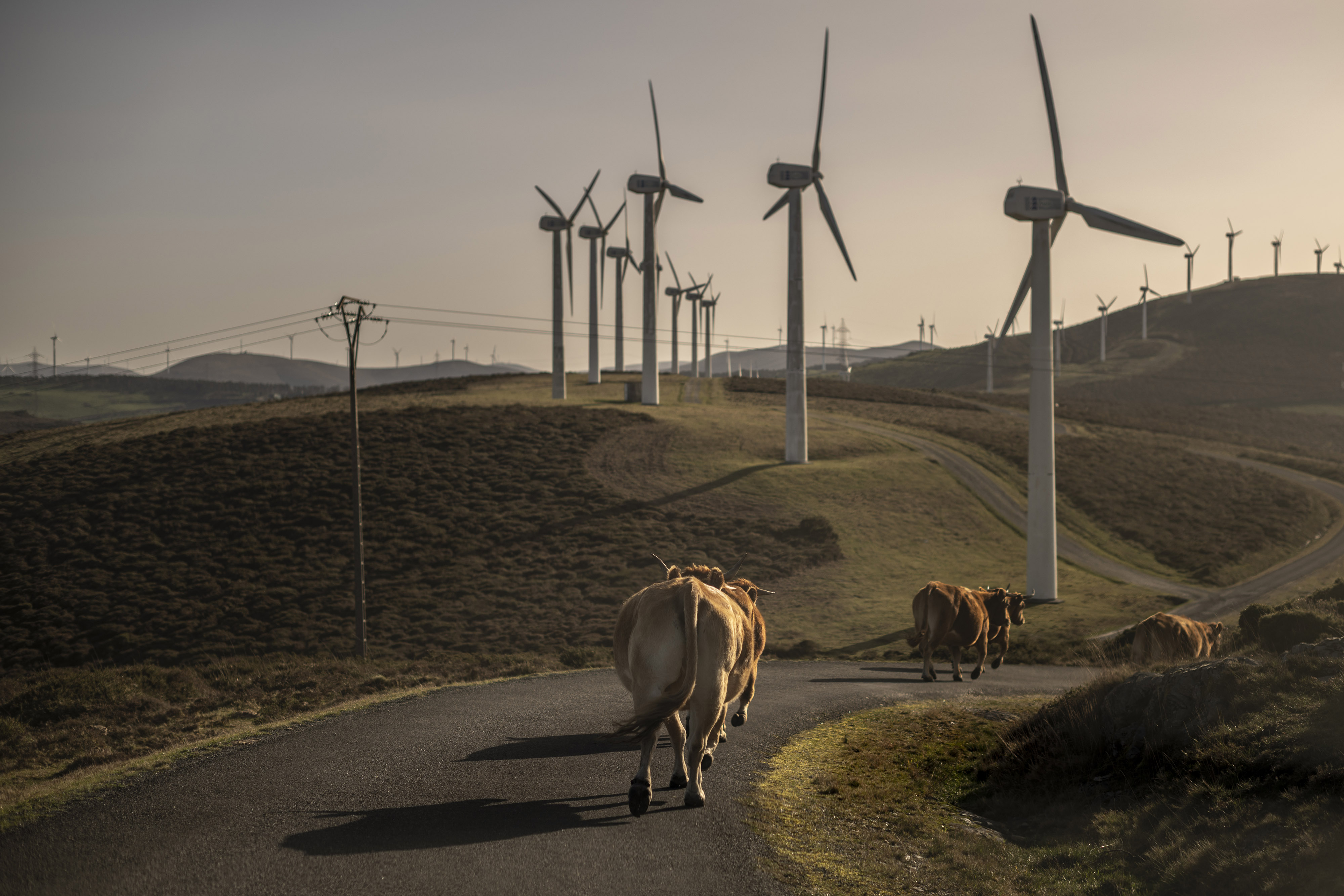 牛群沿着风力涡轮机旁的小路前行,这是伊比利亚电力公司在西班牙穆拉斯运营的Muras I风电场。