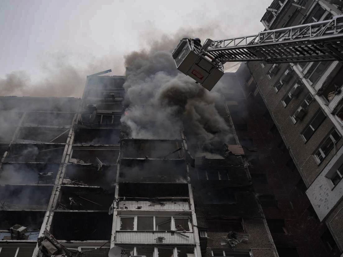 俄罗斯导弹袭击基辅的紧急救援人员于2月7日现场。