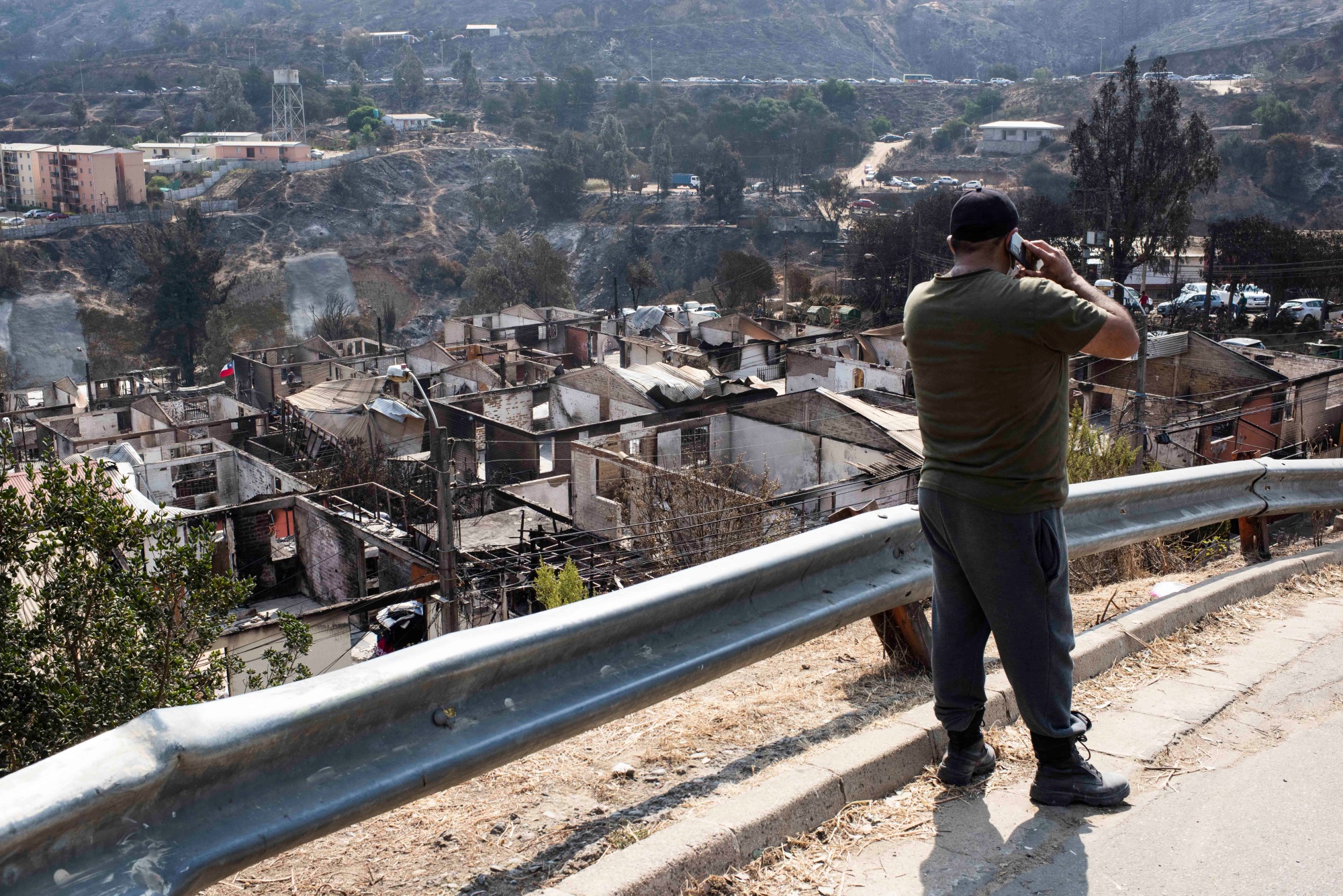 一位居民在2024年2月4日查看智利瓦尔帕莱索大区维纳德尔马的野火造成的破坏。