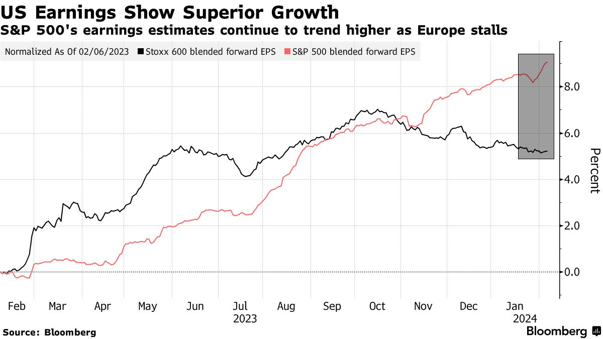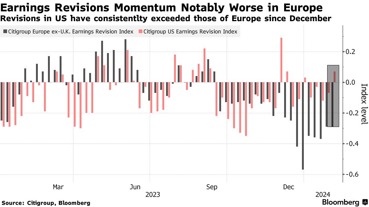 尽管为超出预期而获得了不成比例的回报,欧洲股票的表现仍然落后于美国。截至目前,整个欧洲斯托克600指数今年以来上涨了1.6%,不到标普500指数的一半。股票估值也便宜得多。然而,美国不断增长的预期似乎正在创造某种不对称的风险回报。