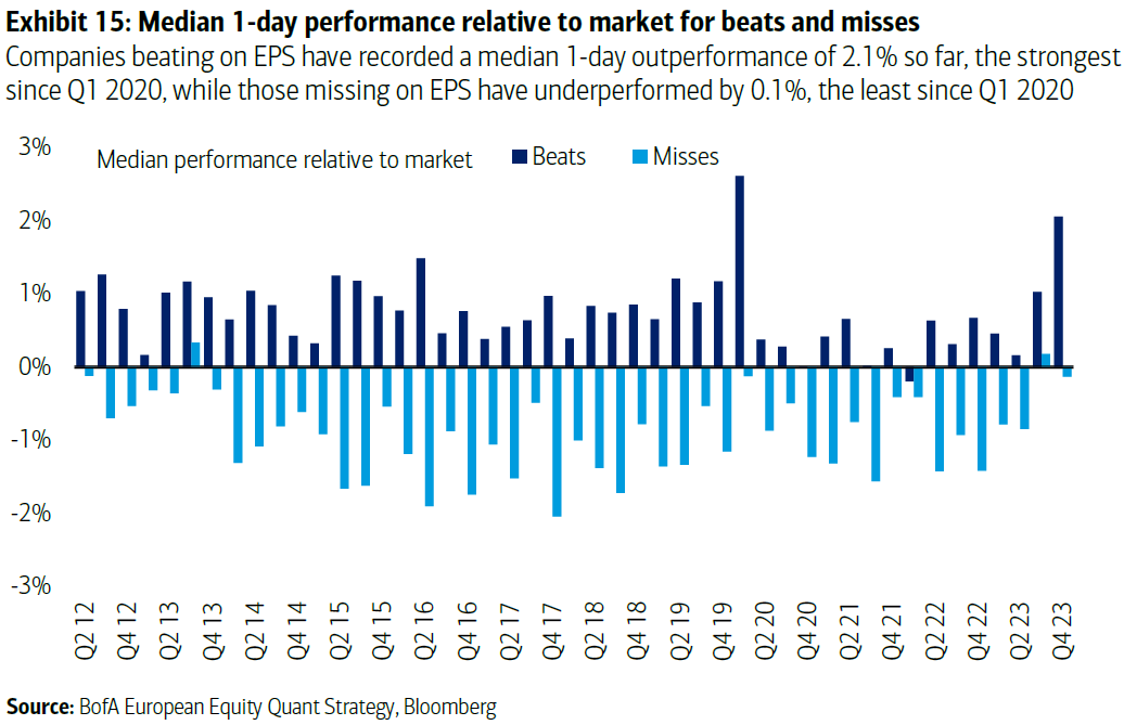 美国银行策略师塞缪尔·布鲁斯估计,自2020年以来,欧洲股市对每股收益超出预期的积极反应最为明显,平均当天表现超出2%。