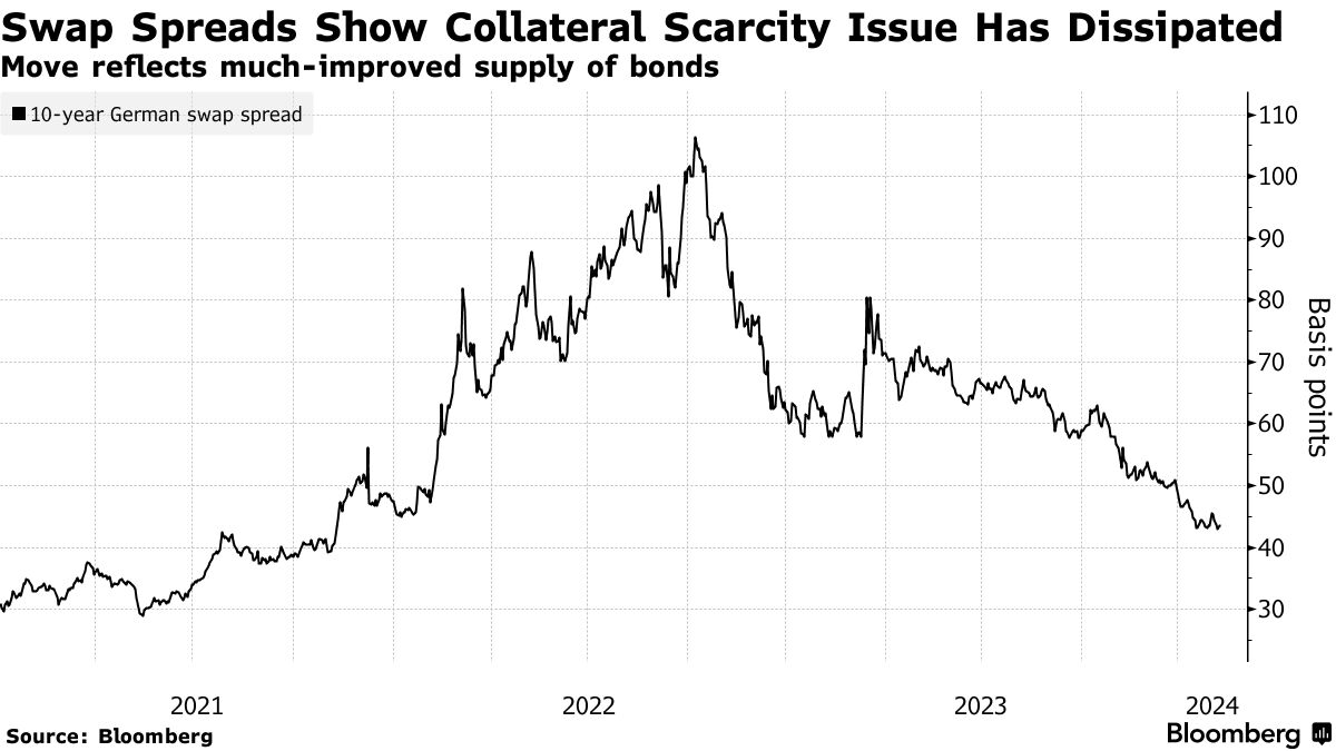 新发现的丰富资源已经削弱了债券收益率和利率互换(一种衍生品)之间的差距,使其水平回到了2022年初的水平,那时欧元区金融管道的问题开始引起警报。