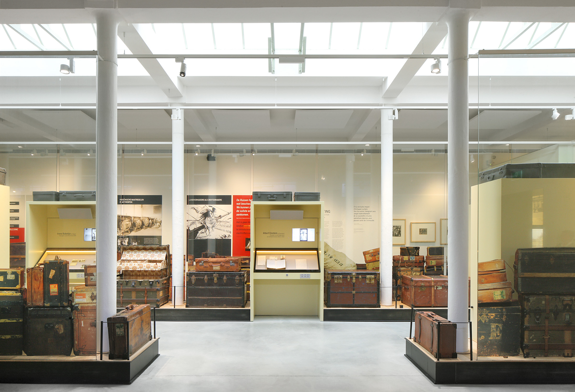 在红星轮船公司博物馆展出的满载行李的展品。摄影师:Filip Dujardin 红星轮船公司博物馆,安特卫普作为纽约埃利斯岛的欧洲对应物,沿着斯海尔德河有几个低矮的红砖棚屋,这里是从1873年到1934年约200万移民前往美国的出发地。在那里,乘客在登上红星轮船前接受了检查和消毒。