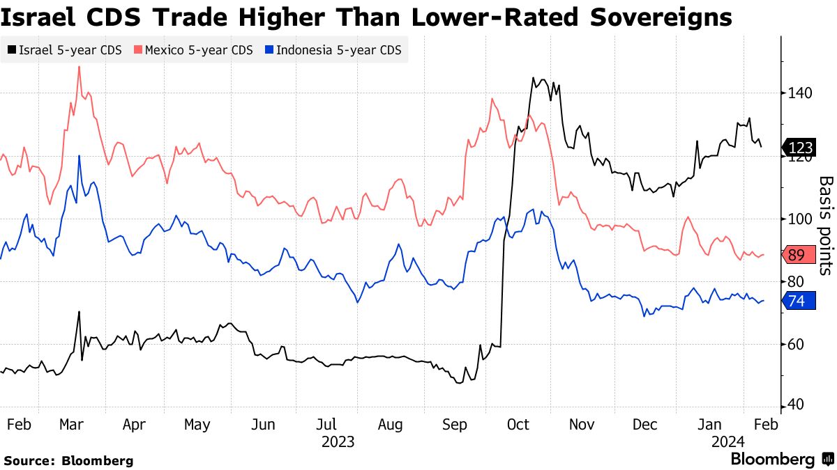 交易商已经将可能的降级价格计入,这意味着降级应该对市场影响不大。未来五年内以色列债务违约保险的成本现在比墨西哥和印度尼西亚等评级较低的主权国家还要高。
