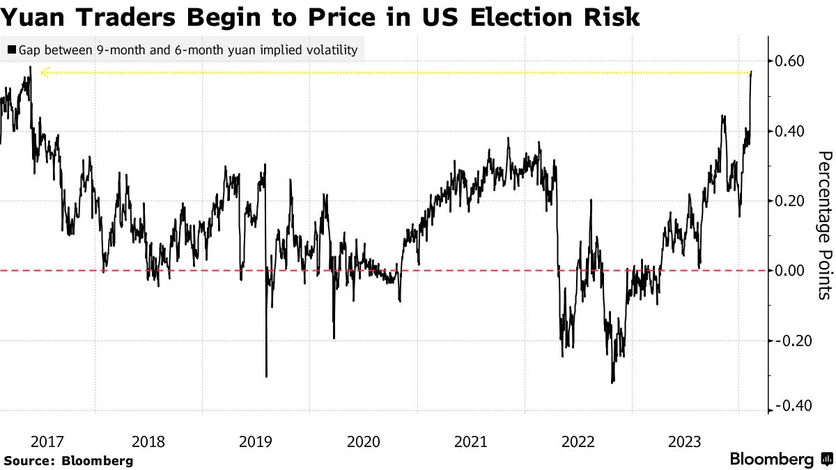 随着这位前总统似乎已经锁定了共和党提名,投资者正在为可能重返美中贸易战时期做准备,这一时期美国对华关税战曾使人民币贬值。特朗普曾暗示要取消中国在美国贸易中的“最惠国”地位,并暗示对其商品征收超过60%的关税。