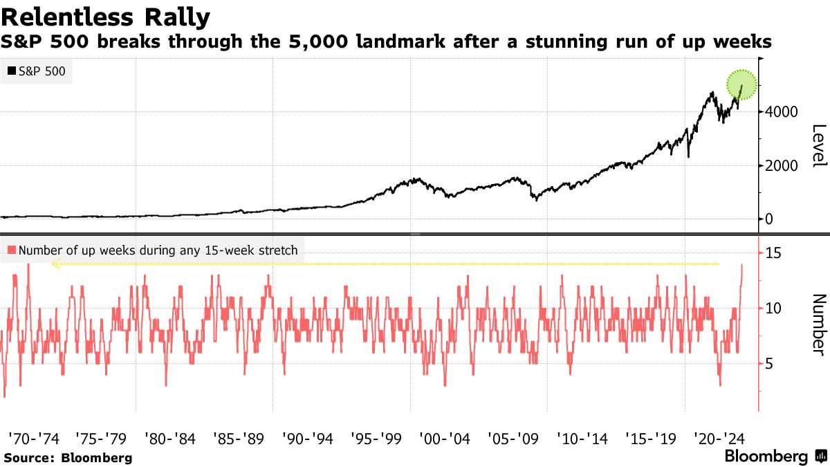 标普500指数的上涨在任何方面都令人叹为观止,包括过去15周中有14周的涨幅——这是自1972年以来最多的。追逐动量的交易所交易基金创下了至少自2013年以来的最佳年度开局。甚至每小时的数据也令人印象深刻。今年的28个交易日中,71%的交易日标普500指数收盘价都高于其日间范围的中点。这打破了四十年来的任何全年数据。