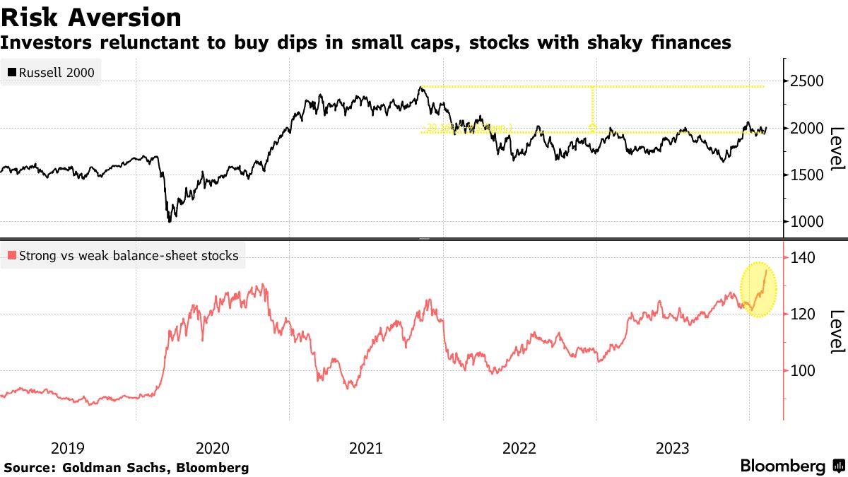 以小盘股为例,它们的命运最为敏感于国内经济增长。较小公司的罗素2000指数今年下跌了大约1%,较2021年的峰值低了20%左右。自1月以来,该指数落后于科技股重的纳斯达克指数8个百分点,标志着自2020年疫情衰退以来,迄今为止的相对回报最差。