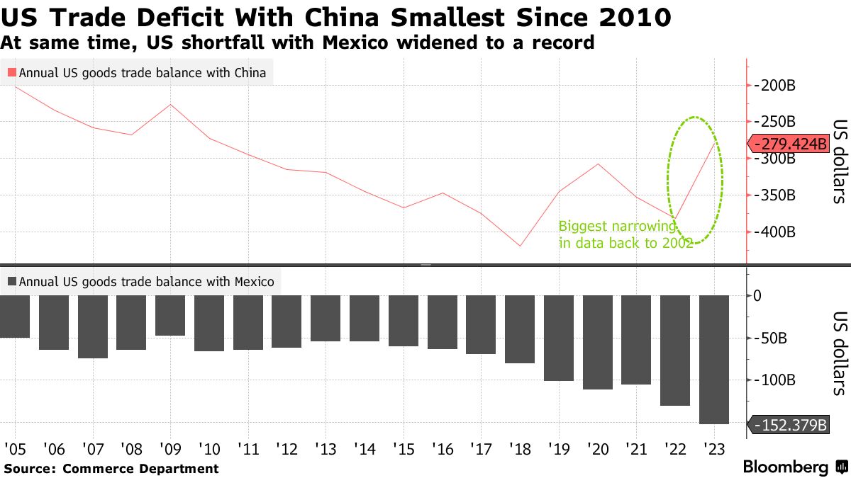 去年美国贸易赤字收窄,这是自2009年以来的最大幅度,因为进口商品价值下降,服务盈余增加。去年美国对中国的商品逆差收窄了27%,至未经调整的2794亿美元,是自2010年以来的最低水平。