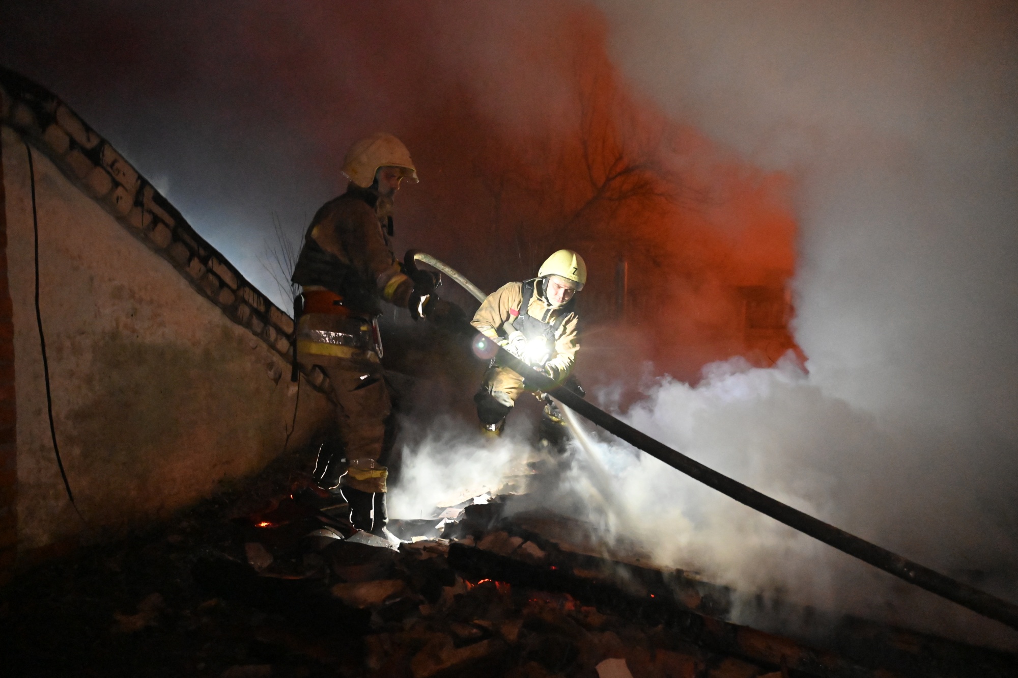 乌克兰紧急和救援人员在哈尔科夫的一次无人机袭击现场工作,2月10日。