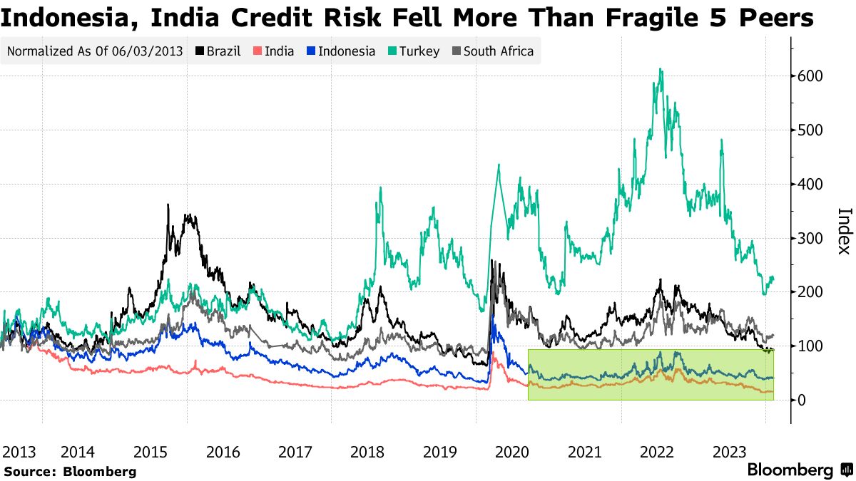 最初的脆弱五国——还包括土耳其、南非和巴西——指的是因其严重依赖外国投资来推动增长而被认为最容易受到风险影响的国家。信用违约掉期反映的改善财务状况显示,自2013年这个词被创造以来,市场对印度和印度尼西亚的看法几乎180度转变。