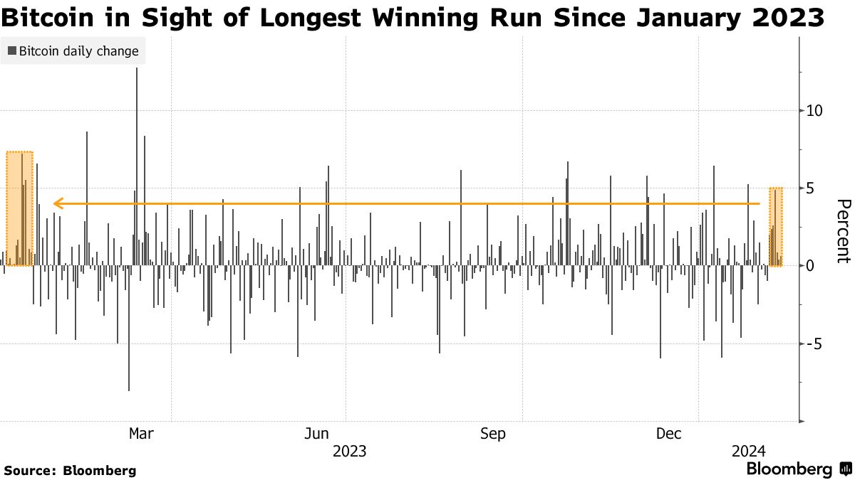 比特币(BTC)接近一年来最长的连胜纪录,ETF资金流入 - 彭博社