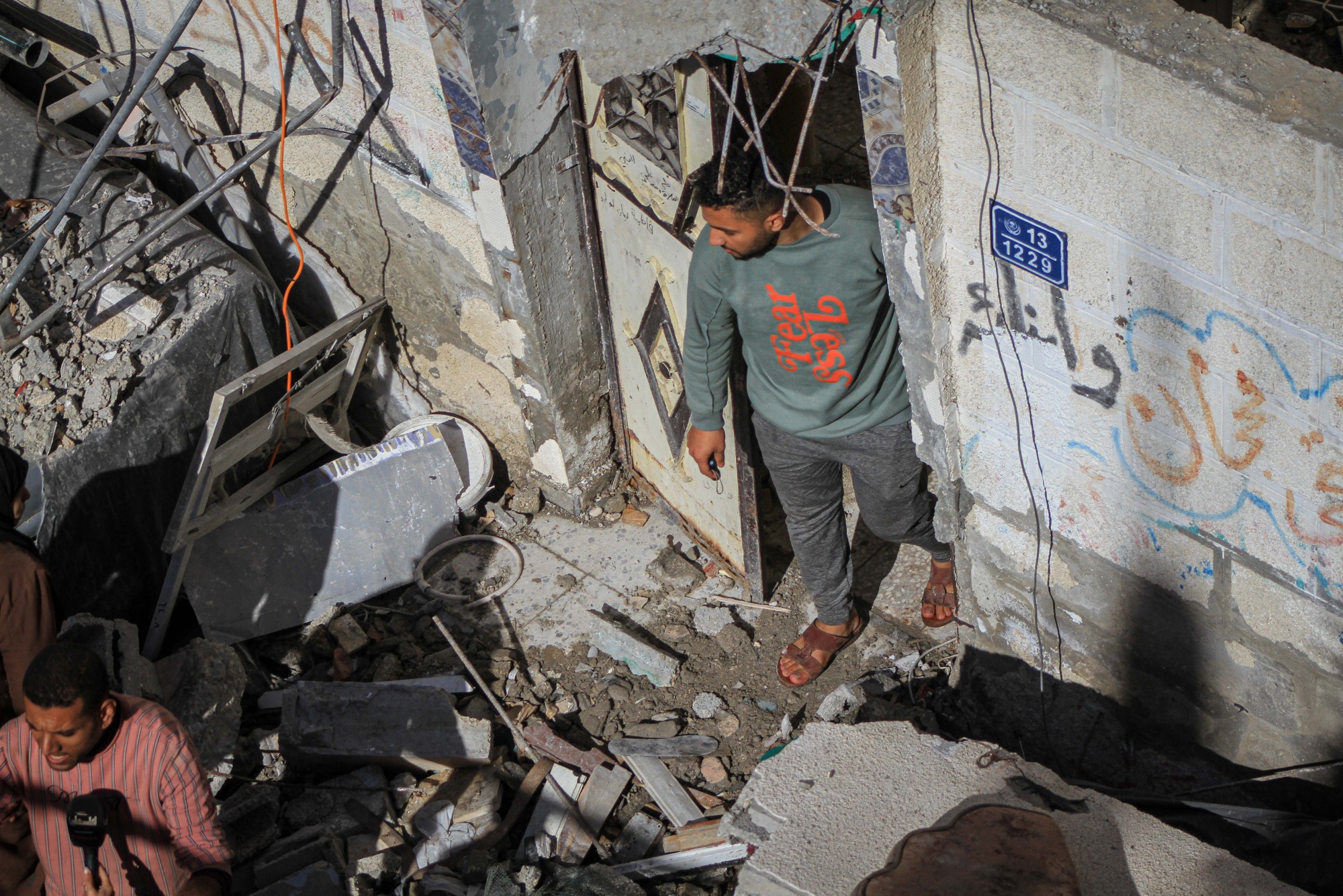 一名巴勒斯坦男子在2024年2月8日以色列对加沙南部拉法的空袭后查看损坏情况。