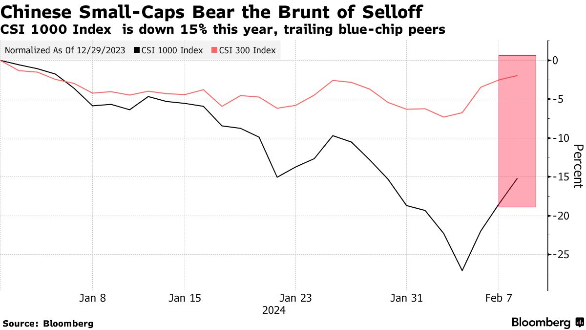 在2023年,中国零售和机构投资者中最受欢迎的交易,小盘股在今年年初遭遇了困难,人们对中国经济健康状况的担忧日益加剧。CSI 1000指数今年下跌了15%,表现不佳的蓝筹指数,因投资者打赌,振兴市场的措施将优先考虑较大的公司。结构性衍生品和量化基金被认为加剧了最近的抛售。